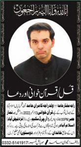 مختار حامد راجہ کی رسم قل منگل ۱۳ دسمبر کو بعد نماز عصر ان کی رہائش گاہ فارم ہائوس نمبر ۵، آرچرڈ سکیم، مری روڈ اسلام آباد میں ادا کی جائے گی۔
