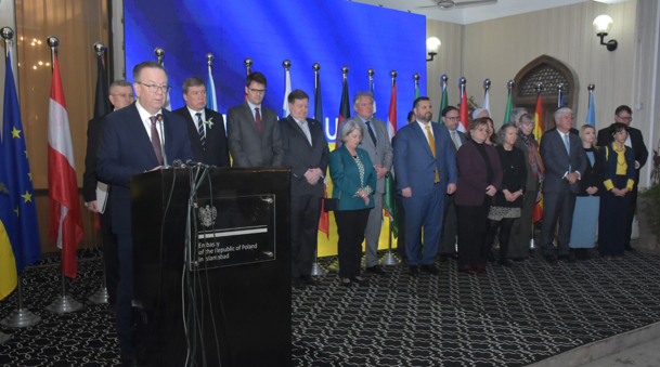 یورپی یونین کے وفد، ٹیم یورپ اور یوکرین کے سفارت خانے کی جانب سے بدھ کے روز روس کی فوجی جارحیت کے چار سال مکمل ہونے پر پولینڈ کے سفارت خانے میں ایک پر وقار تقریب کا انعقاد کیا گیا جس میں سفارت کاروں، سیاستدانوں، صحافیوں، تھنک ٹینک کے نمائندوں، انسانی حقوق کے کارکنوں، این جی اوز اور سول سوسائٹی کے رہنماؤں نے شرکت کی اور یوکرین کے ساتھ اظہارِ یکجہتی کیا ۔