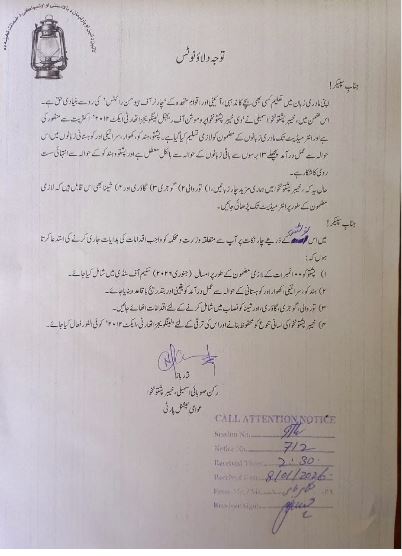 توجہ دلاؤ نوٹس میں مطالبہ کیا گیا ہے کہ پشتو کو 100 نمبروں کے لازمی مضمون کے طور پر جنوری 2026 کی سکیم آف اسٹڈی میں شامل کیا جائے، جبکہ ہندکو، سرائیکی، کھوار اور کوہستانی زبانوں کے حوالے سے بھی عملدرآمد یقینی بنایا جائے۔