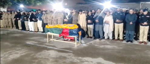 پولیس کے چاق و چوبند دستے نے سلامی پیش کی، افسران نے جاں بحق اہلکار کے جسد خاکی پر پھولوں کے گلدستے رکھے اور ان کے درجات کی بلندی کیلئے خصوصی دعا کی گئی ۔
