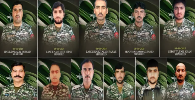 آئی ایس پی آر کے مطابق شہادت پانے والے نو بہادر سپاہیوں میں ضلع خیبر کے رہائشی 38 سالہ نائیک صوبیدار اعظم گل، ضلع کرم کے رہائشی 35 سالہ نائیک عادل حسین، ضلع ٹانک کے رہائشی 34 سالہ نائیک گل عامر، ضلع مردان کے رہائشی 31 سالہ لانس نائیک شیر خان، ضلع مانسہرہ کے رہائشی 32 سالہ لانس نائک تالش فراز، ضلع کرم کے رہائشی 32 سالہ لانس نائک ارشد حسین، ضلع مالاکنڈ کے رہائشی 28 سالہ سپاہی طفیل خان، ضلع صوابی کے رہائشی 23 سالہ سپاہی عاقب علی اور ضلع ٹانک کے رہائشی 24 سالہ سپاہی محمد زاہد شامل ہیں ۔
