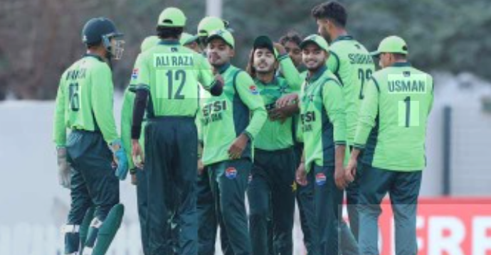 جواب میں پاکستان کےکپتان فرحان یوسف کے 65 رنز کے علاوہ وکٹ پر کوئی بیٹر زیادہ دیر نہ ٹک سکا، لیکن وکٹ کیپر بیٹر حمزہ ظہور نے پاکستان کو مشکل ترین صورت حال سے نکالا ۔